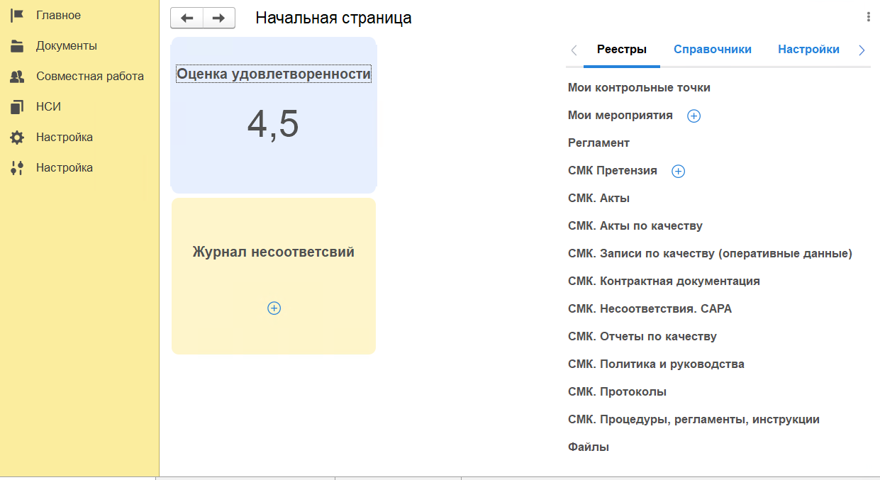 Модуль «1С-КПД:СМК» снимает эту проблему. Это готовое решение с преднастроенными процессами, которое запускается за один день и подходит для большинства предприятий без доработок.