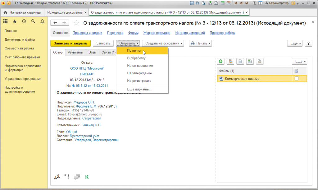 Использование почты, встроенной в СЭД 1С:Документооборот, обеспечивает единое пространство для внешних и внутренних коммуникаций. Система позволяет: