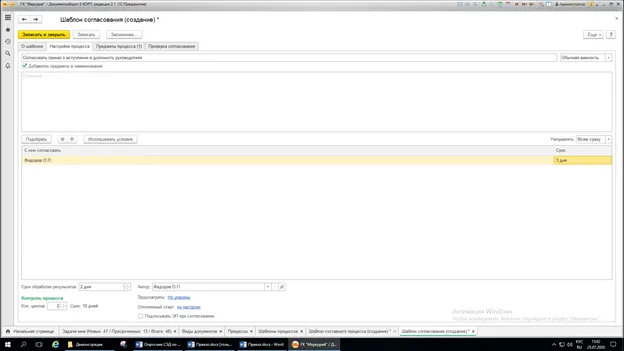 Затем переходим во вкладку «Настройка процесса» и указываем кто и в какой срок должен согласовывать наш приказ.